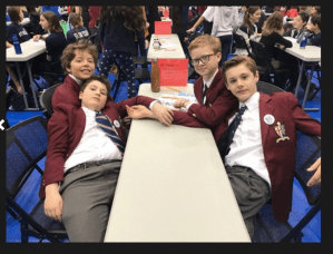 An adult came into the room as we were all finishing up our food, and informed everybody that we were starting. All of the teams finished eating, and we all walked out in a double file towards the rooms where we were playing. It was a longer walk than I had thought it would be, with us walking up and down three or four flights of stairs, and even going outside to move into another part of the school. We sat down in the classroom with our opponents and, once again, Oscar had disappeared into the void. He walked in about a minute later, and we all quietly laughed again. He was shortly followed by the question reader for the game, and we shook hands and got to playing. It was a close game in the beginning, but we consistently pulled ahead throughout the later stages of the game. All the while we were joking among ourselves quietly about the obscurity of many of the questions, “Of course, what a logical answer!”, or by making a bad pun which I will spare you from reading now. By the end, we’d won, but not by a huge margin. We shook hands and congratulated each other on a game well played before leaving for our second game.