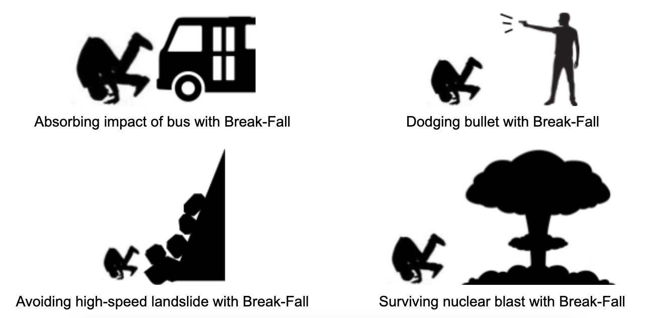 An announcement was made this morning, declaring that all methods of civil safety, including street signs, wave breakers, and building security — things that have cost governments and corporations millions — will all be replaced with a new system: The Break-Fall. With as little as two weeks of training, all able-bodied citizens will be able to avoid injury from all dangerous circumstances. Here are a few diagrams of this innovative safety method at work: